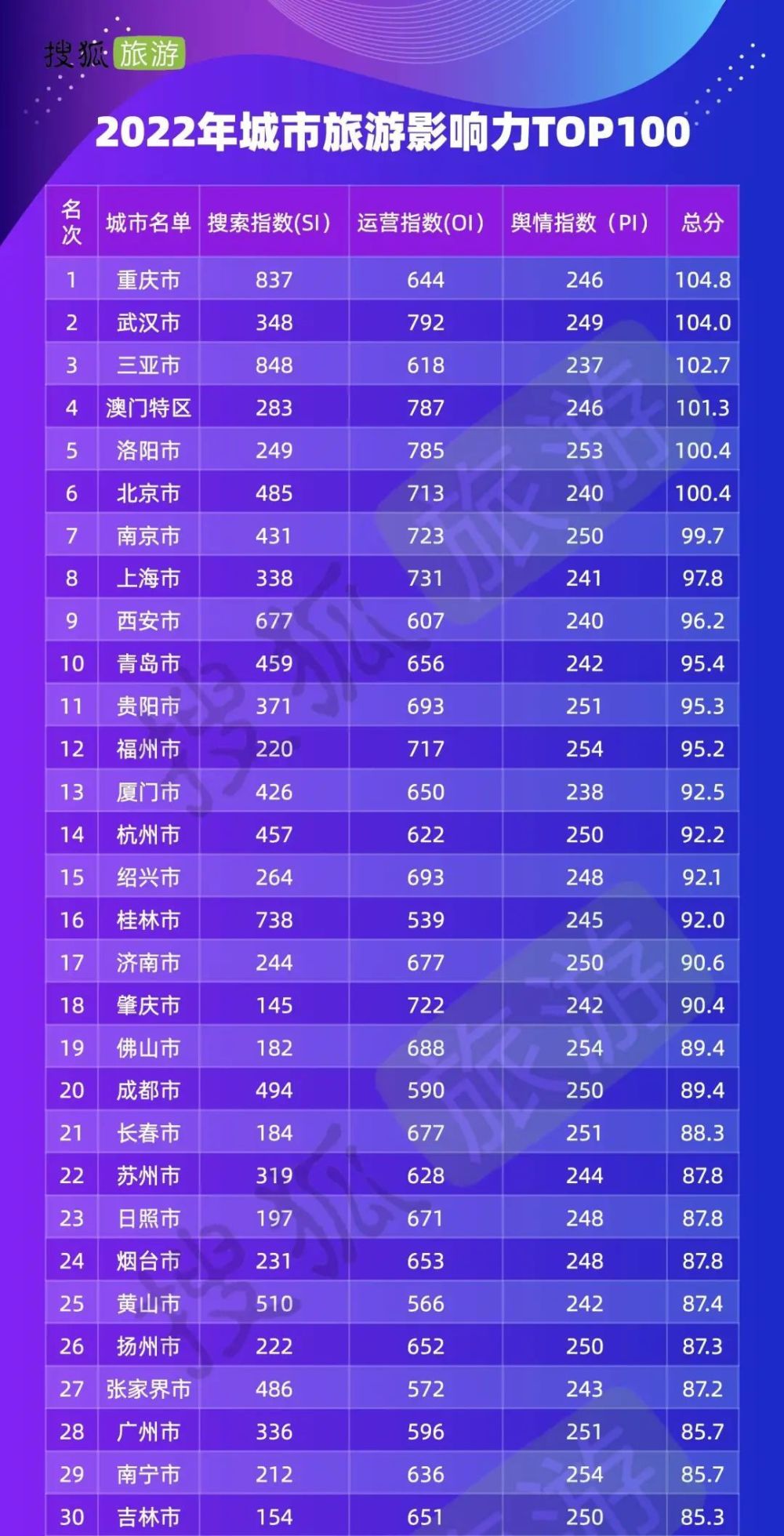 据悉,搜狐旅游近日发布《2022年全国旅游城市品牌影响力报告》。2022年度旅游城市影响力数据以《中国优秀旅游城市检查标准》并由国家旅游局验收的八批中国优秀旅游城市(除县级市外)为样本,构建三大动态反映各地旅游城市品牌影响力的维度,根据每个月互联网公开数据汇总统计而成。