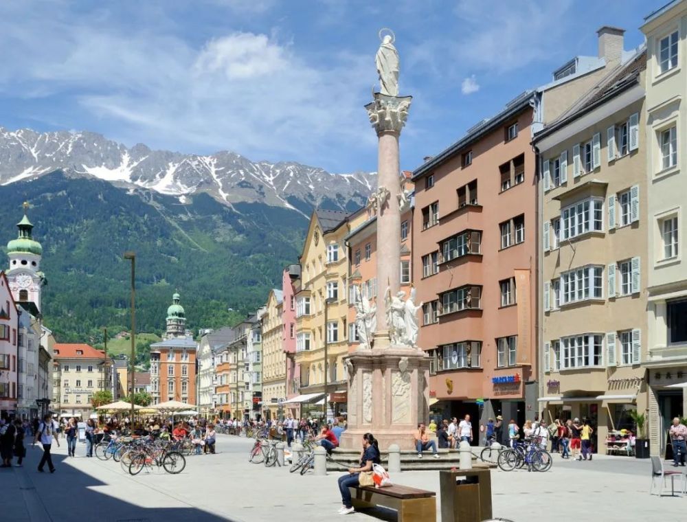 街上精致的安娜柱(Annazuil)周围热闹非凡。有街头音乐家的表演,游客在柱子周围的高地上寻找一个地方。我买了一个冰淇淋,看看街上,看看是什么让因斯布鲁克如此特别:环绕着城市的山脉非常靠近城市,总是能提供特别上镜的背景。