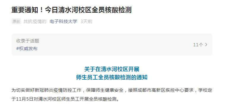 学校发布《告全院师生员工书》,崇州校区本周末学生不出校门,实行封闭管理,绵竹校区学生不得离开当地。如有特殊情况,必须按照“学生家长——辅导员——二级学院——学生处——疫情防控办公室”的流程逐级请假报备,返校时提供24小时核酸检测阴性证明。从11月5日起,近14天(含周末),崇州校区所有教职工、从业人员不得离开崇州。