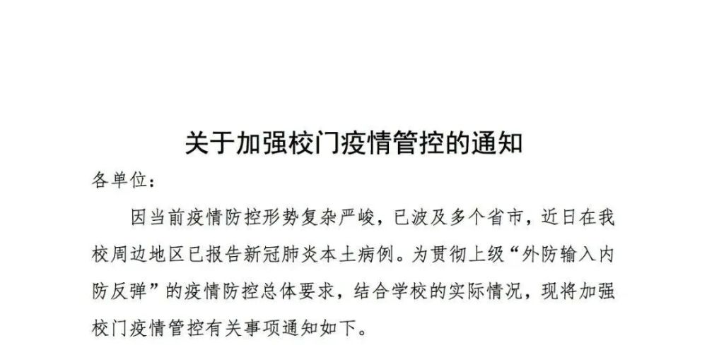 学校发布《关于加强学校疫情防控工作的紧急通知》,指出学校立即进入应急状态。要求严格加强门禁管理,做到关口前移;要求强化人员排查,做到不疏漏一人;要求落实人员管控措施,实行分级分类归口管理;要求严格活动审批,非必要不举办;要求坚决遵守防控要求,做好个人防护;要求强化监督,严格问责。