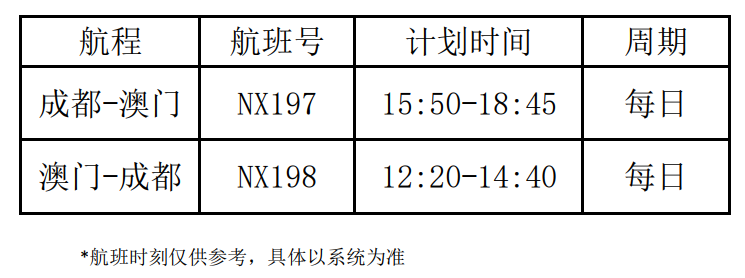 成都=澳门航班信息如下表: