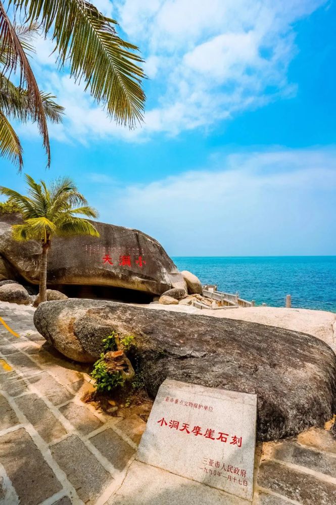 南山,古称“鳌山”,因其形状如巨鳌潜伏于琼南滨海而得名。“大小洞天”景区就位于真正意义上的古代“鳌山”——南山,作为风景名胜,这里可谓历史悠久,现如今遗存在景区内的摩崖石刻群便是很好的佐证。