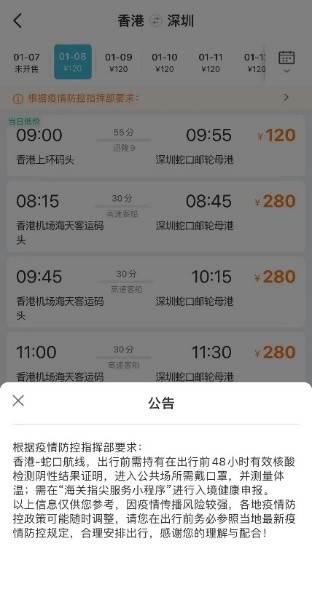 1月8日香港首阶段正式通关的渠道,除三个口岸、机场和港珠澳大桥外,自中国客运码头、港澳客轮码头坐船也可到达内地。8日早上8:20,时隔近三年,第一班船从中国客运码头出发。目前,点开去哪儿旅行APP首页的“汽车·船票”频道,就可购买深圳、香港、澳门、珠海之间的船票。