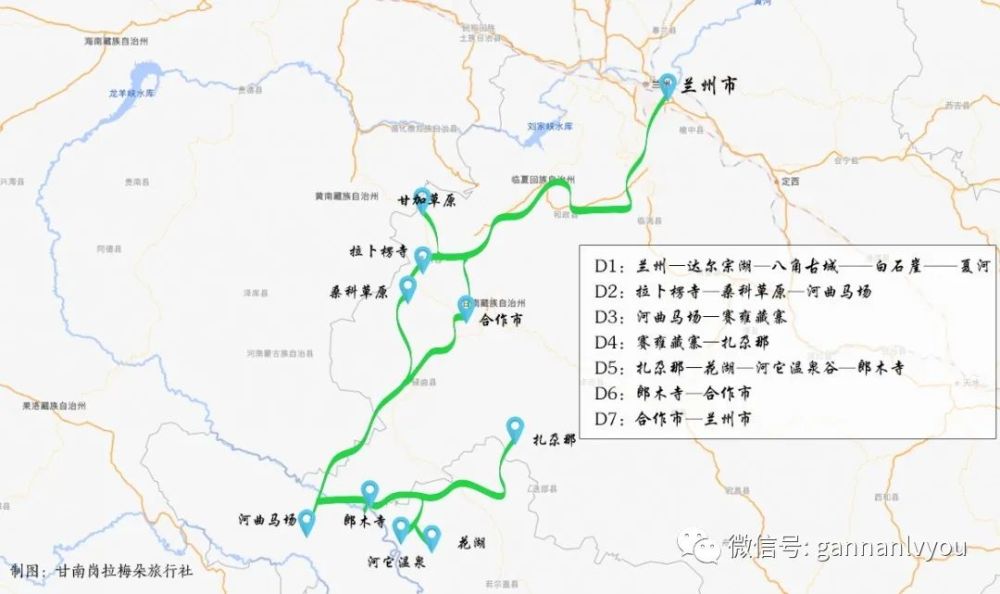 兰州到甘南沿途可经过景点:甘肃省博物馆兰州黄河风情线中山桥白塔山五泉山水车园苦水丹霞青城古镇什川梨园黄河三峡炳灵寺太极岛松鸣岩临夏大拱北东公馆蝴蝶楼和政古生物化石馆康乐莲花山竹子沟至甘南境。