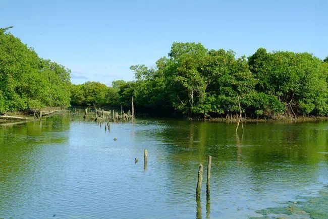 在涨潮时分,茂密的红树林树干被潮水淹没,只露出翠绿的树冠在碧波中荡漾,成为壮观的“海上森林”。