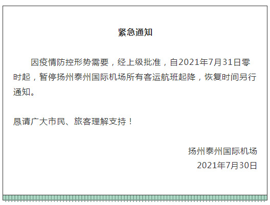 7月30日晚,江苏扬州泰州国际机场发布紧急通知,自2021年7月31日零时起,暂停扬州泰州国际机场所有客运航班起降。