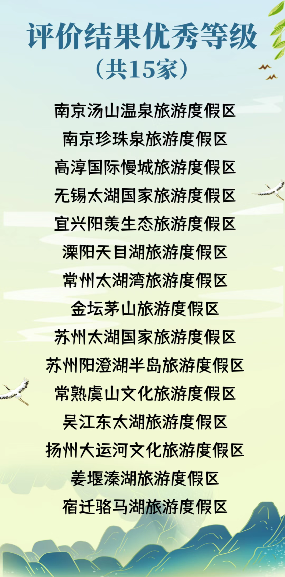 据介绍,截至目前,全省共有旅游度假区62家,其中国家级旅游度假区7家,省级旅游度假区55家,数量均居全国第一。根据《江苏省旅游度假区发展评价办法》规定,《江苏省旅游度假区发展评价评分细则》共设置8个一级指标、39个二级指标和21个三级指标,总分值为1000分。评价结果分为优秀、合格、基本合格与不合格四个等级。