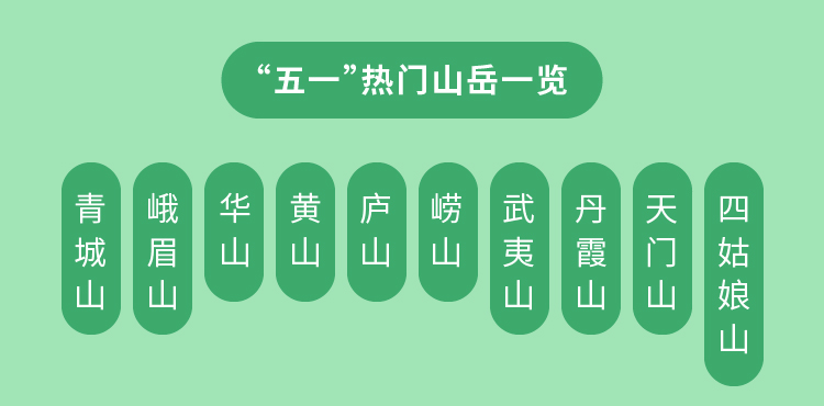户外风的盛行,促使登高望远成为最热门的户外游项目之一,青城山、峨眉山、华山、黄山、庐山、崂山、武夷山、丹霞山、天门山、四姑娘山等山岳景区热度靠前。