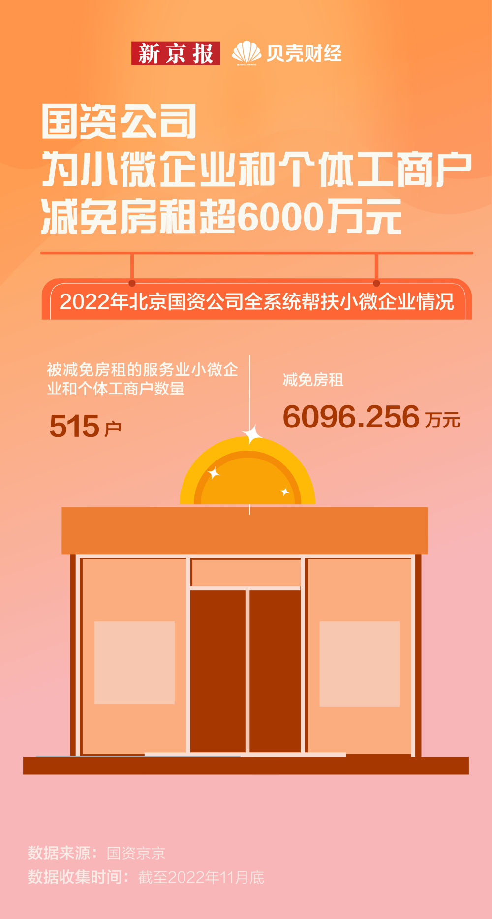 自北京针对中小微困难企业出台一揽子帮扶政策以来,北京国资公司全系统各级企业通力协作,数据显示,截至今年11月底,北京国资公司全系统2022年度已累计为500余户服务业小微企业和个体工商户减免房租超6000万元。