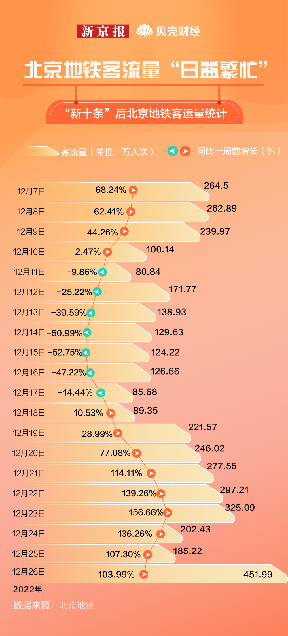 各单位、公司逐步开启“复工模式”,地铁也重回往日客流量。北京公共交通客流量近日大幅上升,其中10号线“最忙碌”。北京地铁数据显示,2022年12月26日北京地铁客流量达451.99万人次,同比上周增长103.99%,所辖线中客流量最高的是10号线,达84.77万人次。