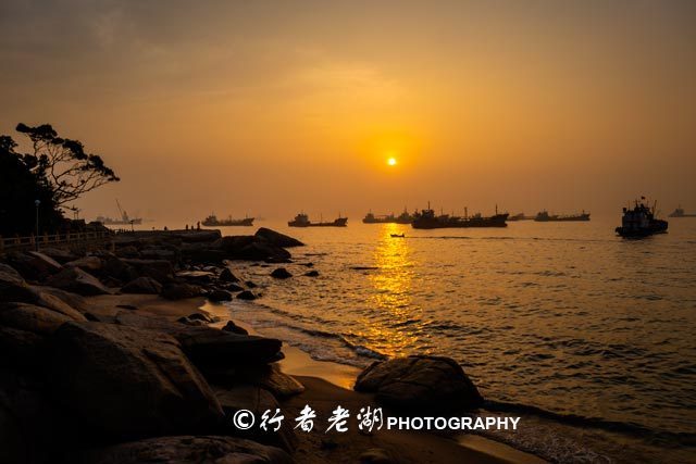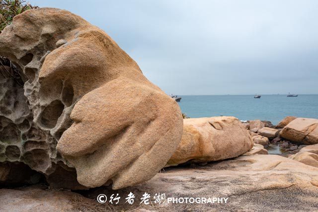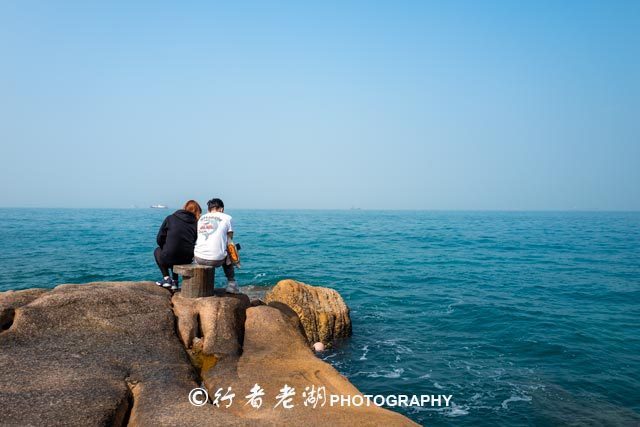 走过伶仃湾拱桥,继续走右边的玉带环腰海边路,这里也是“金石奇观”,这里的石头景色比起左边那条玉带略逊。但是,这里是看日落的好地方,不少人坐在海边的礁石上,等候着日落时分,看着太阳从渔船的桅杆慢慢落入海中。