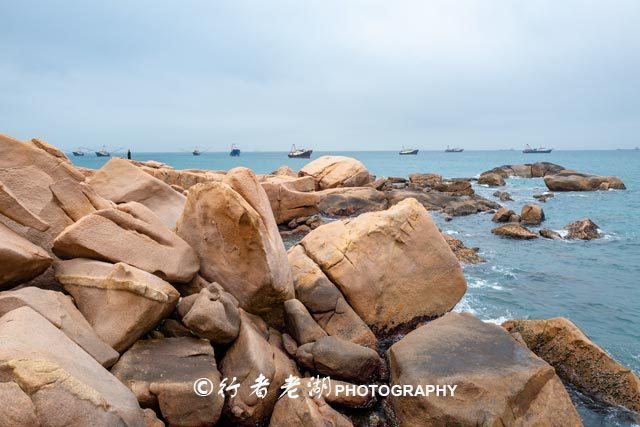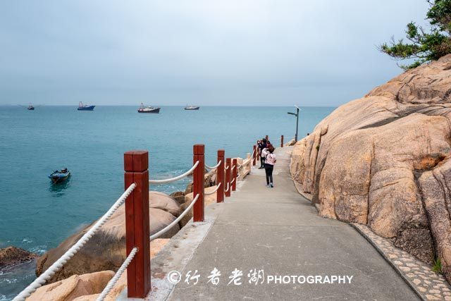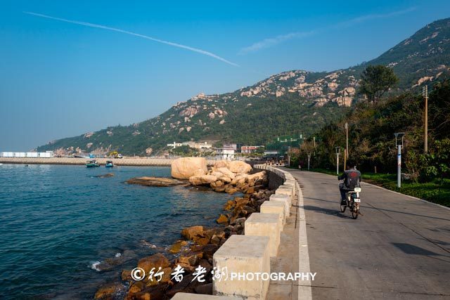 这条海边道路景色很好,可以说是水清石奇,巨大的沙石被海浪冲刷得浑圆。如果是遇到风高浪急,可以看到海浪在岩石上激起一米多高的白色浪花,远处的渔船像是蚂蚁一样,在海平线上缓缓移动。