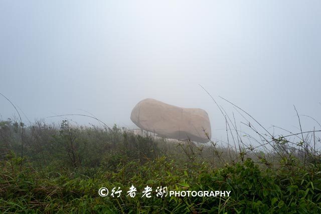 返回往山顶的路,继续前行,有一处景色十分令人惊讶,一块巨大的石头,地下仅仅只是两个小石支撑,彷佛随时会滑下山去。走到快到伶仃峰的时候,有一处广场,这里有卫生间、观景台,还有一处禁止进入的禁区。从这里往上走是外伶仃岛的石景公园,有巨鲸石、海豹石、鹰隼石、阴元石,可惜雾太大,即使站在山顶,什么也看不见, 终于明白了这处景色为什么叫做“雾海仙槎”。