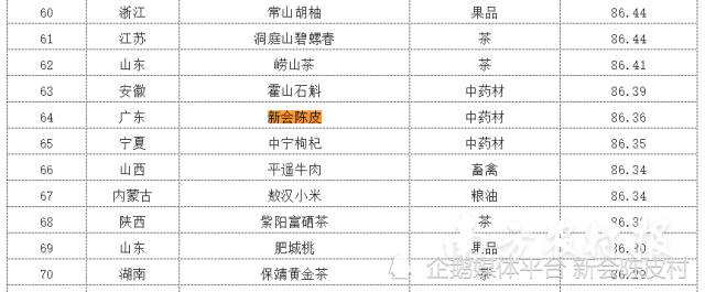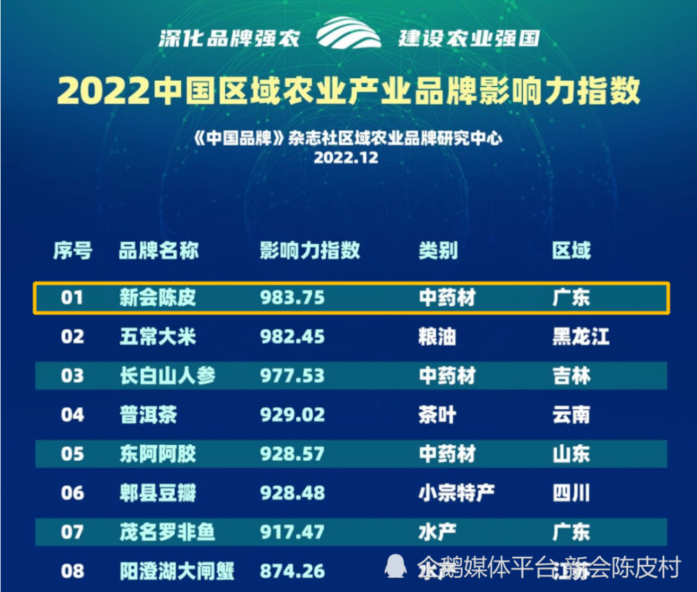 12月26日,2022中国区域农业品牌发展论坛暨中国区域农业品牌年度盛典系列活动”在北京线上举行,活动权威发布了《2022中国区域农业品牌发展报告》、“2022中国区域农业形象品牌影响力指数TOP100”、“2022中国区域农业产业品牌影响力指数TOP100”等,其中,新会陈皮以983.75的品牌影响力指数,首次位居“2022中国区域农业产业品牌影响力指数TOP100”第1。