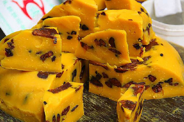 (5)黄米切糕,赤峰特色小吃。赤峰南部较干旱,生产的黄米粘性大,做出的粘糕粘而不沾,“筋道”而不“懈胎”。蒸出的粘糕色泽金黄,配之以红芸豆和大红枣,色、香、味俱佳。