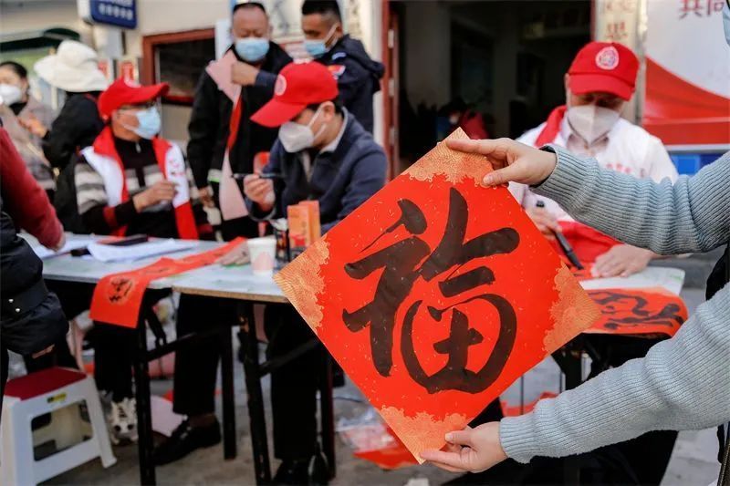 铺纸、研磨、笔尖轻轻回转,一幅幅火红的对联,将书法艺术和中国传统文化的“福”“春联”文化紧密结合起来,在“写春联区”,市文化馆文化志愿者们挥毫泼墨,为大家写下一幅幅春联和“福”字,浓浓的年味也跃然纸上,市民捧着这些字迹飘香的春联,个个笑意盈盈、爱不释手。