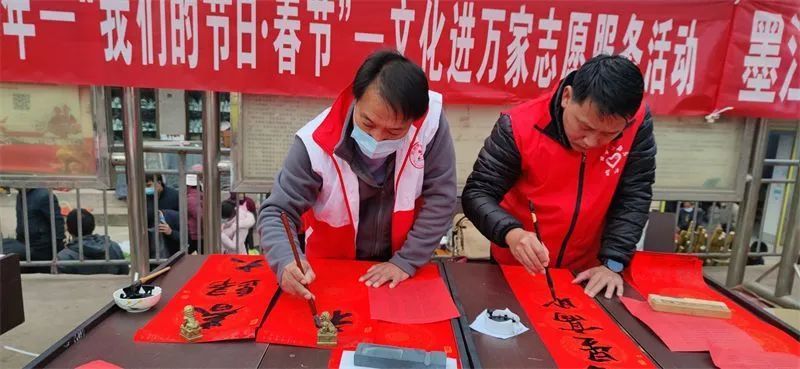 活动精选春联1600副、“福”字800个、“门神”800个、年历300份、历书100余份供群众选择。现场人头攒动、气氛热烈,墨江县书法家协会的老师现场挥毫泼墨、笔走龙蛇,一幅幅吉祥春联苍劲灵动、一个个“福”字铿锵有力,传递着满满的新春祝福,在冬日里散发出暖暖的“年味”。