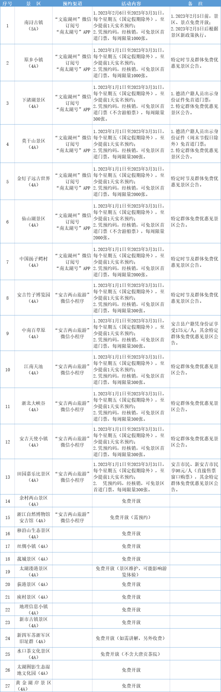 湖州市文化广电旅游局于2023年1月1日—3月31日开展“相约星期五、免费游湖州”文旅惠民活动,每周五全市27家4A级及以上景区向游客免费开放,本次活动具体包括这些景区: