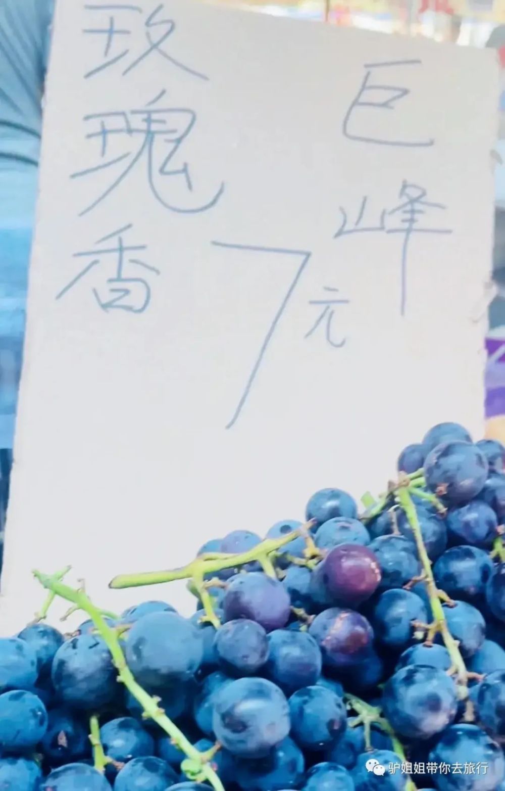 菜摊上的老板们都会用硬纸箱裁成长方形纸牌子写上价格插到菜堆里。各种新鲜葡萄大多数是7元,西红柿2元,西瓜1元,哈密瓜10元两颗,羊肉68,牛肉75,还有好多蔬菜这价格也很便宜。老妈开心的说要这个要那个。如果不是我用力拦着,估计老妈能搬回一车东西来,如果长期住在这里可以任性买买买,我们只是路过而已。结帐的时候老妈惊到了!懵了!
