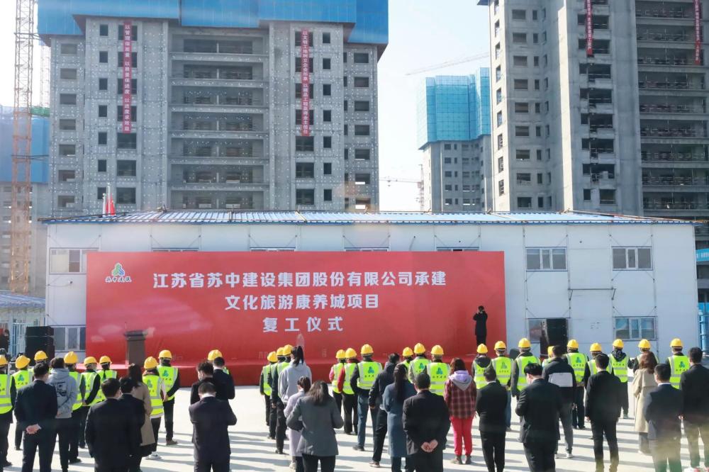 复工仪式现场,施工单位负责人介绍,江苏苏中建设集团股份有限公司作为恒大文化旅游康养城的承建单位,一直秉承严格按照各项技术规程、规范要求施工,安全、高效、优质开展项目建设,始终恪守高质量按时交付的底线,只为不负每位业主的信任和期待。全体人员将全力落实“复工复产保交楼”工作,誓以最大决心、最大力度确保工程建设顺利推进。
