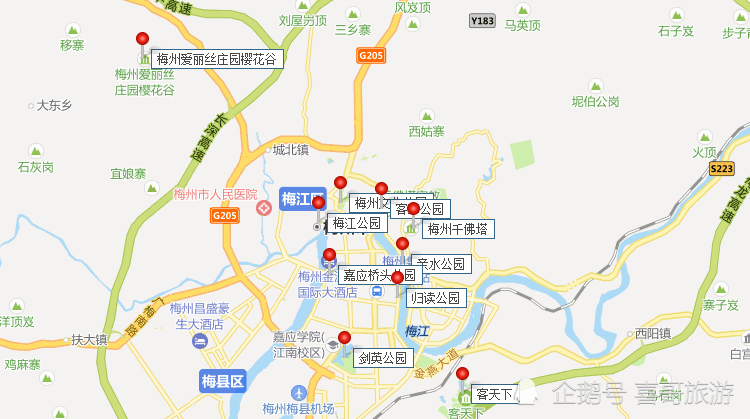 2、梅江区十大景点自驾游行程路线:梅江区-梅江公园(剑英纪念大桥)-梅州爱丽丝庄园樱花谷-嘉应桥头公园-剑英公园-客天下-归读公园-亲水公园-梅州千佛塔-客家公园-梅州文化公园-梅江区。