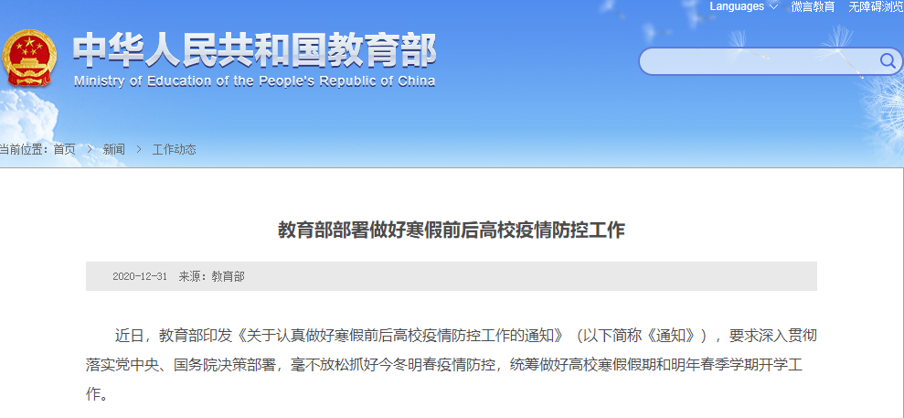 12月31日,教育部印发《关于认真做好寒假前后高校疫情防控工作的通知》,要求抓好今冬明春疫情防控,统筹做好高校寒假假期和明年春季学期开学工作。