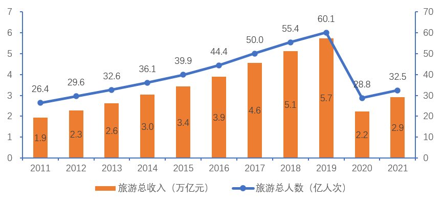 2021年,随着国内疫情形势的好转,旅游市场呈现积极复苏态势。国内旅游者出游32.46亿人次,比2020年增长12.8%。其中,城镇旅游者国内出游23.42亿人次,增长13.4%;农村旅游者国内出游9.04亿人次,增长11.1%。
