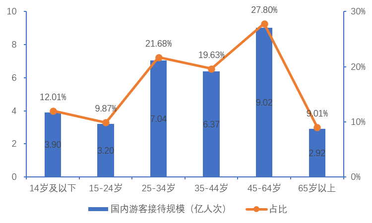 2021年45岁以上的中老年旅游者合计出游11.94亿人次,占据了国内旅游客源市场的36.81%,成为了国内旅游市场的重要客源。与此同时,14岁及以下青少年旅游者增速较快,“一老一小”成为了国内旅游的亮点和重点,老年旅游、康养旅游、研学旅行等具有广阔前景。