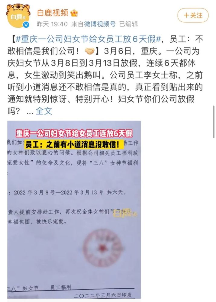 据报道,3月6日,重庆一公司为庆妇女节从3月8日到3月13日放假,连续6天都休息,女生激动到笑出鹅叫。公司员工李女士称,之前听到小道消息还不敢相信是真的,真正看到贴出来的通知就特别惊讶、特别开心!