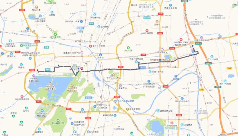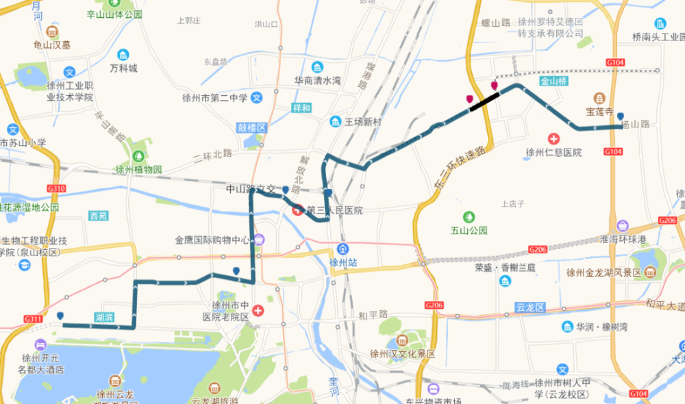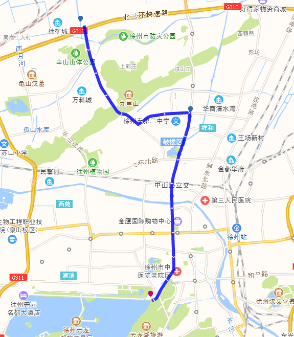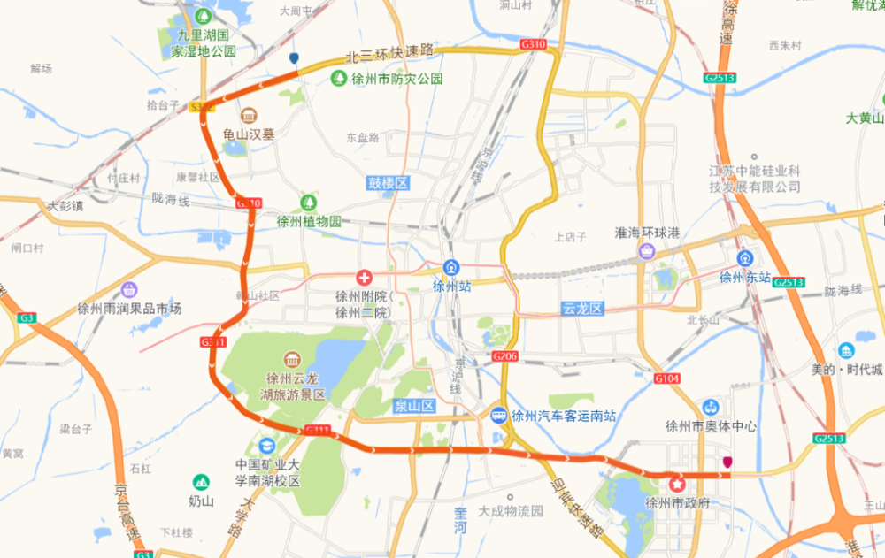 途经道路:三环西路、新淮海西路、淮海西路、淮海东路、复兴南路、铜山路、徐海路、鲲鹏路。