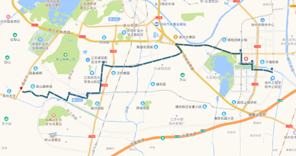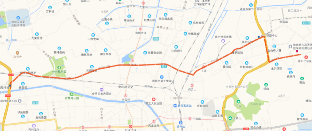 停靠站点:西苑人家、中海九樾、徐州植物园、和园爱家、九龙湖公园、建材中专、堤北市场、二九宿舍、杨庄、鼓楼法院、开发区中学、金山桥公交停车场。