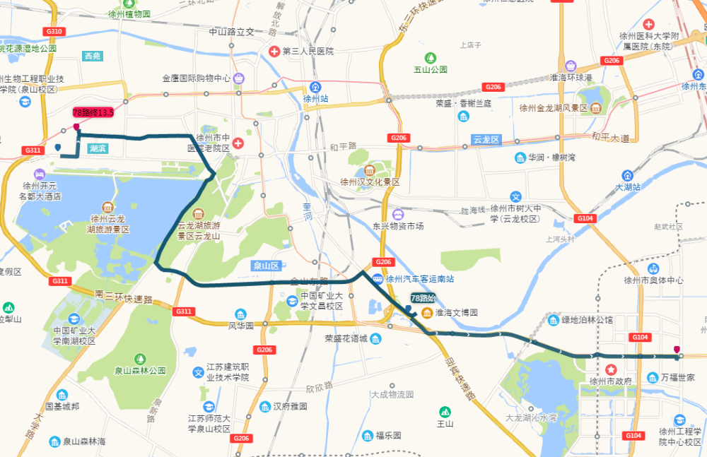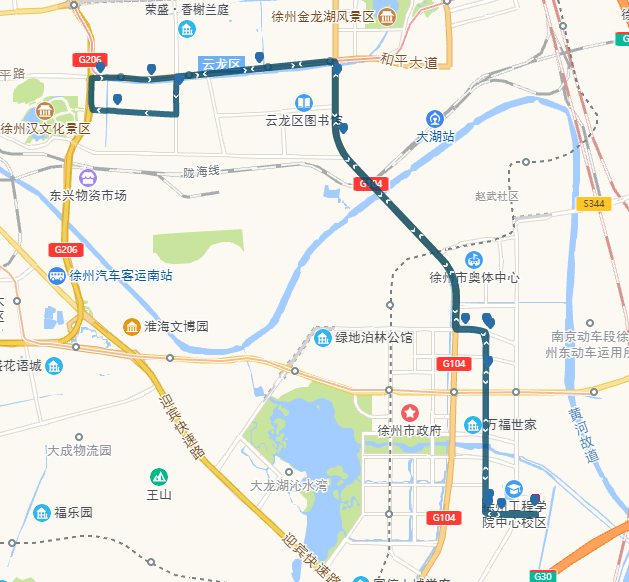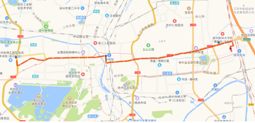 途经道路:复兴北路、淮海东路、彭城路、建国西路、中山南路、湖东路、湖南路、珠山西路、玉带大道。