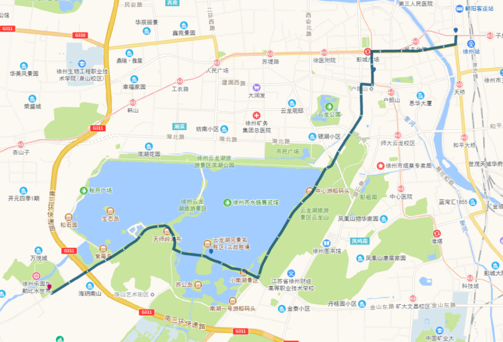 途经站点:徐州站、万虹桥电子市场(文化宫)、供销大厦、彭城饭店、中山饭店、中医院、云龙山、云龙湖旅游风景区(滨湖公园东门)、云龙山索道、金山公园、南湖水街、观鱼沉水廊道、天师广场、钓鱼岛、珠山、徐州乐园。
