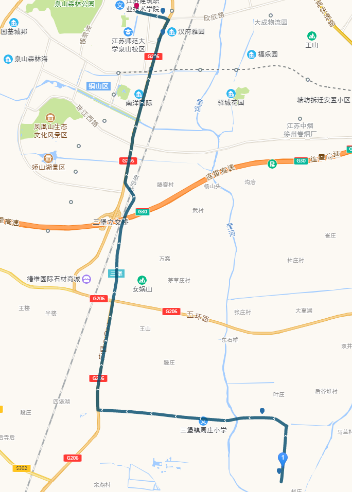 停靠站点:刁店、胜阳集团、黄桥村西、何庄、新何村、彭城驾校、石牛广场(单)、潘楼(单)、收费站(单)、四堡、上楼、青龙山、监管中心、三堡示范园、三堡中学、三堡服务中心、三堡市场、久久集团、药厂路口、新庄、宝马4S店、徐州国药、铜山二堡、徐州农商银行、港鑫城、玉泉河地铁站、万科新都汇、铜山万达、医药高职校、铜山中学、建筑学院(上海路口)、建筑学院。