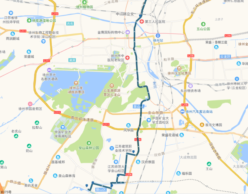 途经站点:韩山村南、滨湖花园(韩山路)、湖滨新村西、湖滨新村、湖滨路口(湖滨路)、纺南小区北门、矿总医院(明珠路)、吴庄花园、血液中心、银湖小区东、云龙山隧道、云龙湖旅游风景区(滨湖公园东门)、云龙山索道、金山公园、金泰馨雅园、省财校、营房东门、孟庄公寓、泰山汇景花园、大学城、矿大北门、七里沟、汽车南站、淮海文博园(食品城)、大龙湖、行政中心、元和路、明正路(单)、人才家园公交首末站。