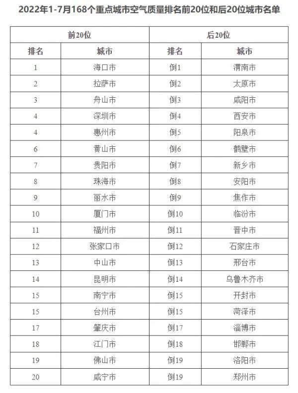 具体到城市来看,168个重点城市中,海口、拉萨、舟山市等20个城市空气质量相对较好(从第1名至第20名);渭南、太原、咸阳市等20个城市空气质量相对较差(从倒数第1名至并列倒数第19名)。