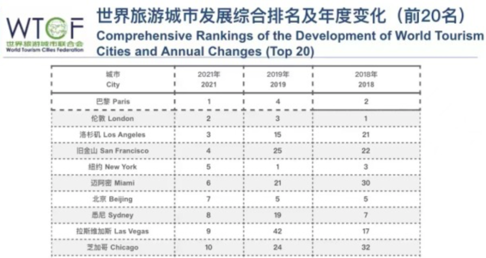 关于世界旅游城市发展的综合排名,主要的参考价值是通过平行的比较和历史的比较来跟踪旅游业的发展趋势,排名不是目的,比较趋势是最重要的宗旨。报告显示,前20名城市的排名变动比较明显。2021年,巴黎综合排名第一,伦敦排名第二,洛杉矶排名第三,北京排名第七,上海排名第十二。
