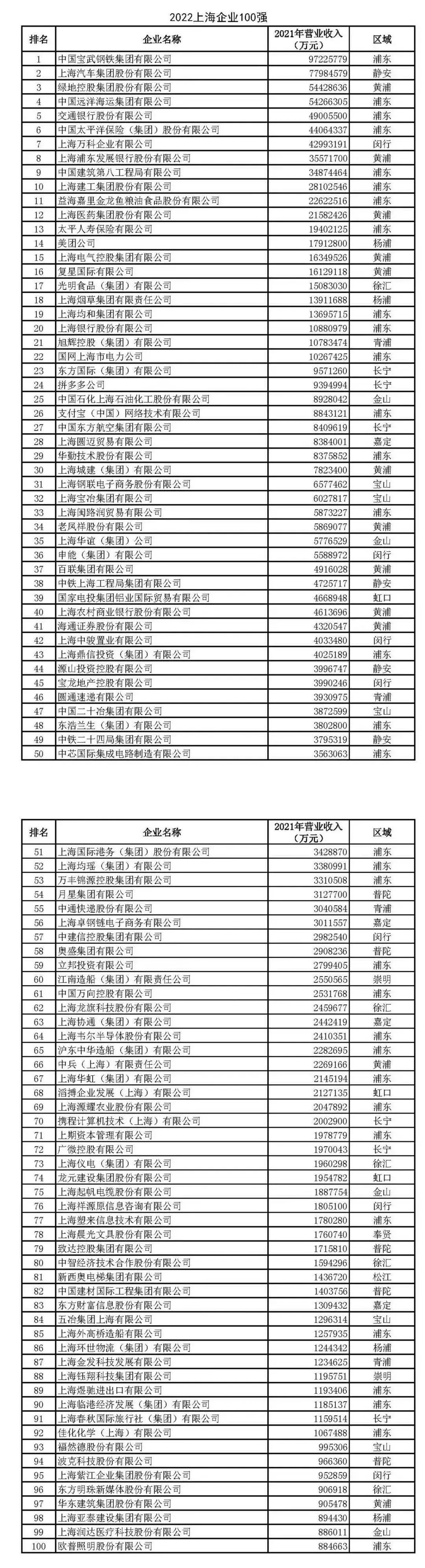 8月30日发布的2022上海百强企业排行榜显示,宝武集团、上汽集团、绿地集团、中远海运、交通银行、太平洋保险、上海万科、浦发银行、中建八局、建工集团入围2022年上海百强企业前十名。前十强中,6家位于浦东、2家位于黄浦,静安、闵行各1家。