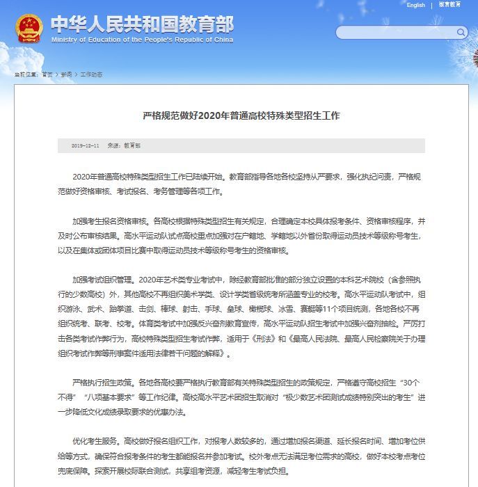 12月11日,教育部发文规范普通高校特殊类型招生工作,明确2020年招生取消对“极少数艺术团测试成绩特别突出的考生”进一步降低文化成绩录取要求的优惠办法。此外除部分院校,高校不再组织美术学类、设计学类校考。
