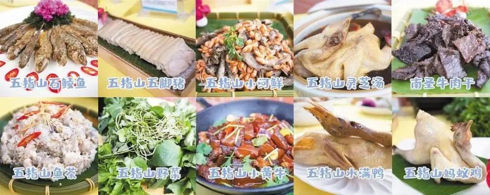 五指山十大名菜:五指山五脚猪、五指山蚂蚁鸡、五指山灵芝汤、五指山石鲮鱼、五指山水满鸭、五指山小黄牛、南圣牛肉干、五指山鱼茶、五指山小河鲜、五指山野菜系列(五指山蒌叶、雷公根、树仔菜、百花菜、鹿舌菜 、雷公笋等)