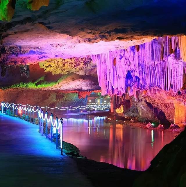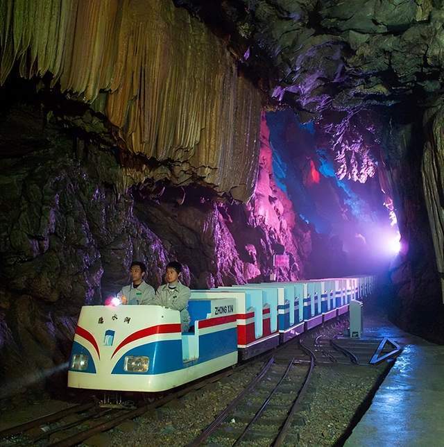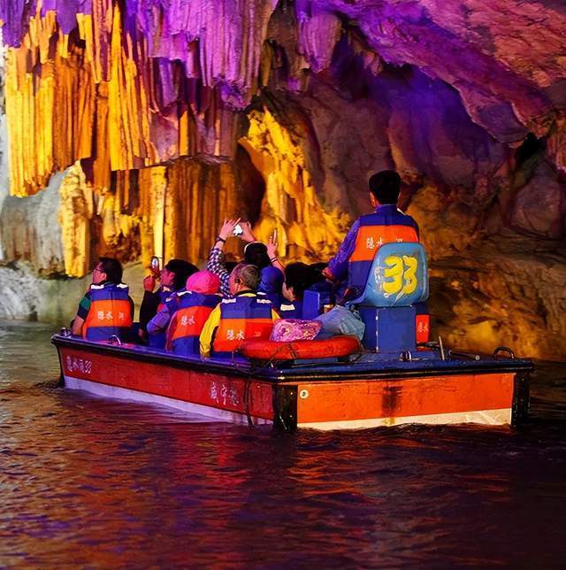 隐水洞景点的游览分三部分:上游1/3游人可泛舟地下河,中游1/3可乘坐轨道车,下游1/3可步行,洞中一游,终身眷念。