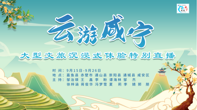 “云游咸宁大型文旅沉浸式体验特别直播”将于9月15日至9月26日通过云上咸宁、咸宁台官方抖音、视频号全媒体平台同步呈现,节目播出期间,还有大量景区门票、优惠券免费大派送!