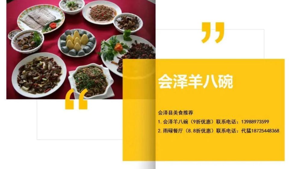 (二)美食推荐:会泽羊八碗(9折优惠)、雨碌餐厅(8.8折优惠)、会泽十八寨酒家、火红砂锅羊肉 、会泽猪八碗