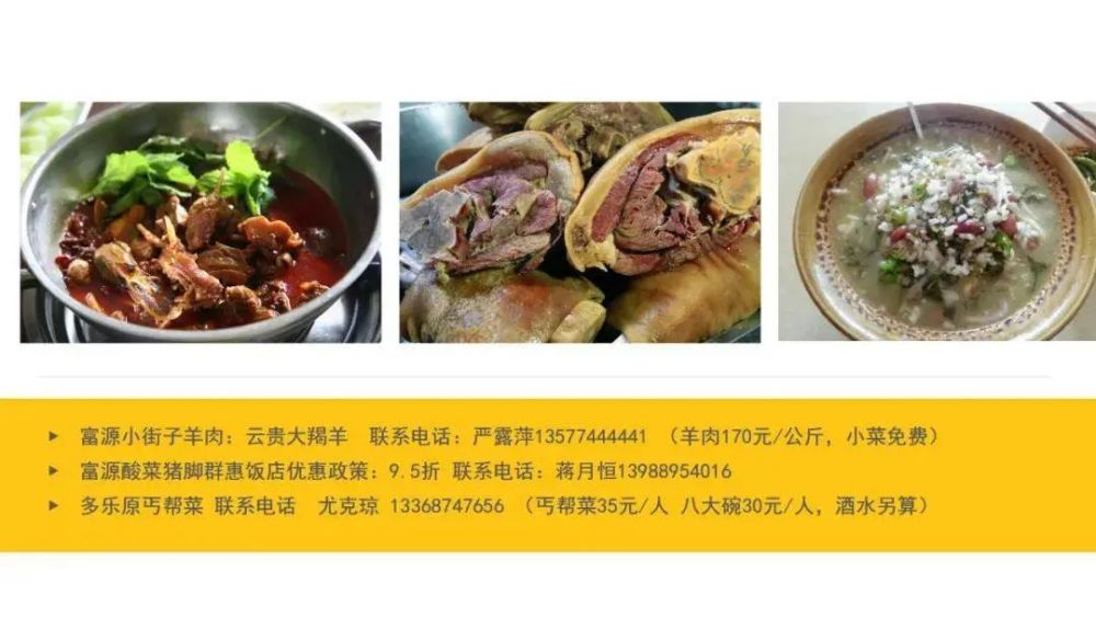 (二)美食推荐:富源小街子羊肉(羊肉170元/公斤,小菜免费)、富源酸菜猪脚群惠饭店(9.5折)、多乐原丐帮菜(丐帮菜35元/人、八大碗30元/人,酒水另算)