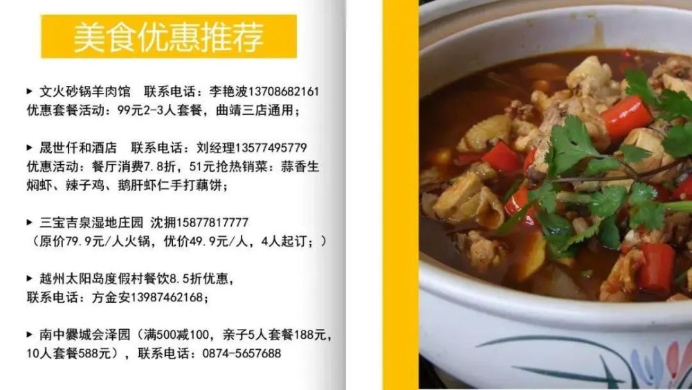 (二)美食推荐:鸿春园李小胖正宗沾益老字号辣子鸡(8.5折优惠)、海峰生态农家乐(消费满500元以上8.8折,满300元以上9.5折,需提前预定)、德庄柴火鸡及特色炒菜(9折优惠)、玉泉湾温泉度假区(9折优惠)