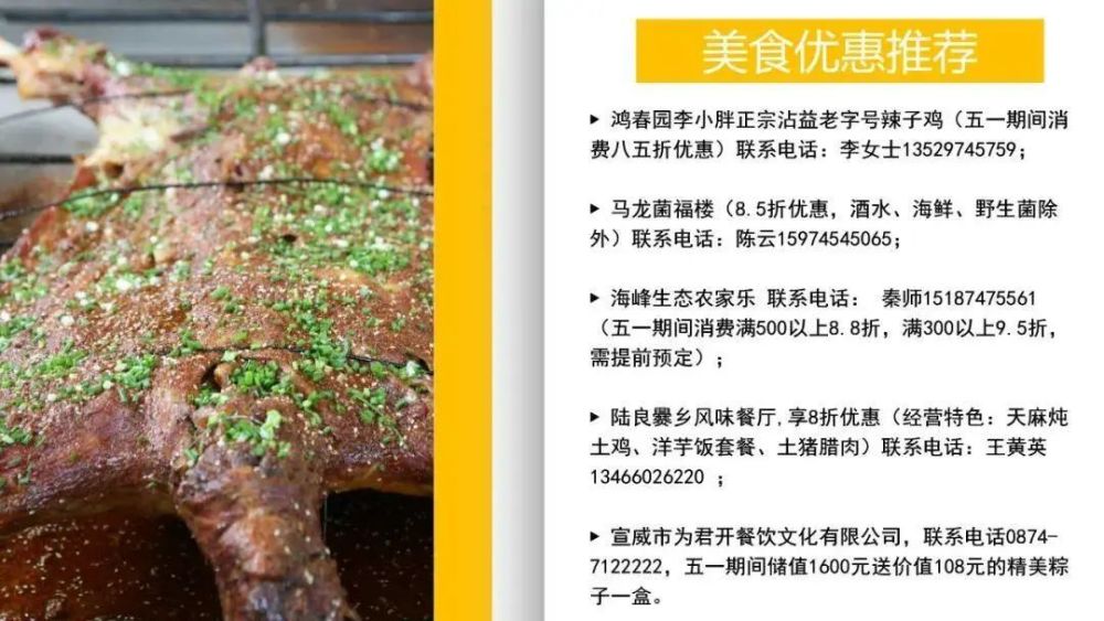 (二)美食推荐:宣威市为君开餐饮文化有限公司(储值1600元送价值108元的精美粽子一盒)、滇能国际大酒店(餐饮9折优惠)