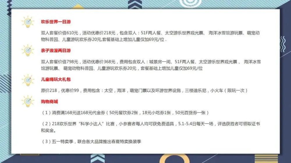 原价798元,活动优惠价368元,费用包含双人:城景房一间、51F两人餐、太空游乐世界观光票 、 海洋冰雪馆游玩票、 萌宠动物科普园、儿童游玩欢乐券20元,套餐基础上增加儿童仅加69元/位