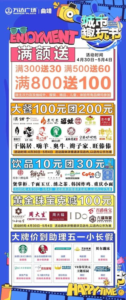 (三)购物推荐:万达购物广场(餐饮及购物满200元送100元)、南中爨城(爨陶、斑铜非遗传习馆购物享7折优惠)