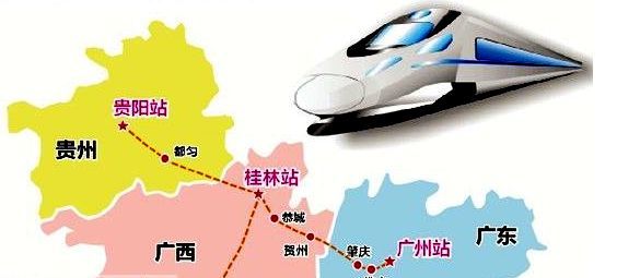 贵广高铁自贵阳北站起,经黔南州、黔东南、广西桂林、贺州、广东肇庆、佛山等地,终至广州南站,全长857公里,全程只需3.5小时。