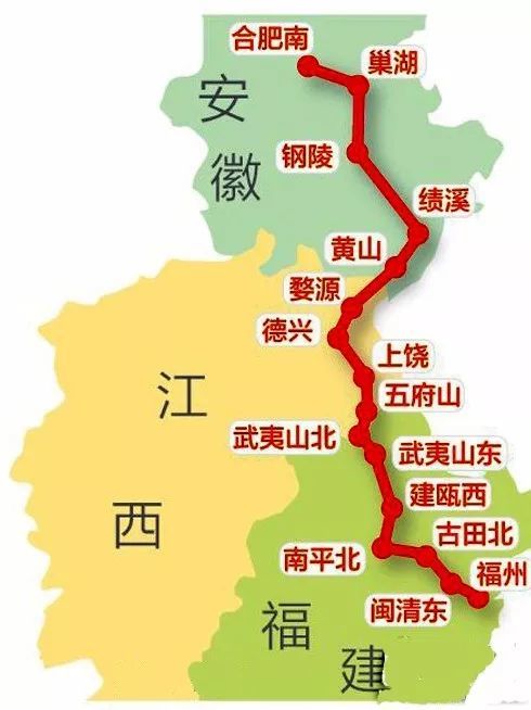 合福高铁,是京福高速铁路的南段,是沟通华中与华南地区的一条大能力客运通道,途径站点依次为合肥南、长临河、巢湖、无为、铜陵北、南陵、泾县、旌德、绩溪北、黄山、婺源、德兴、上饶、五府山、武夷山北、武夷山东、建瓯西、南平北、古田北、闽清东、福州。